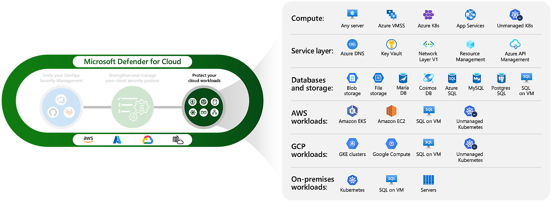 Cloud Workload Protection Platforms (CWPP), such as the one offered through the Microsoft Defender for Cloud CNAPP solution, protect a wide variety of workloads across multi-cloud environments. The diagram below references all types of workloads you can protect the pricing can be viewed here as it differs per workload.