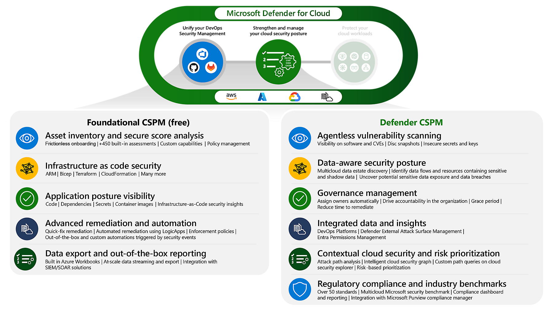Defender Cloud Security Posture Management (CSPM) plan: this plan combines everything in the basic plan and builds on top of that with more advanced cloud security features.