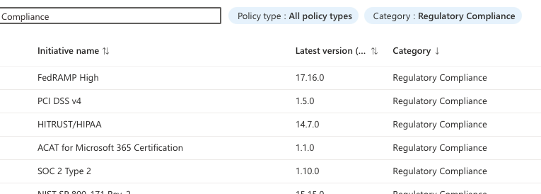 One of the leadership team’s biggest concerns was ensuring compliance with regulatory standards like PCI DSS or ISO 27001. Azure Policy addresses this challenge through its built-in Regulatory Compliance Standards. These standards come with predefined initiatives that group related policies to ensure your resources align with industry requirements. For example: